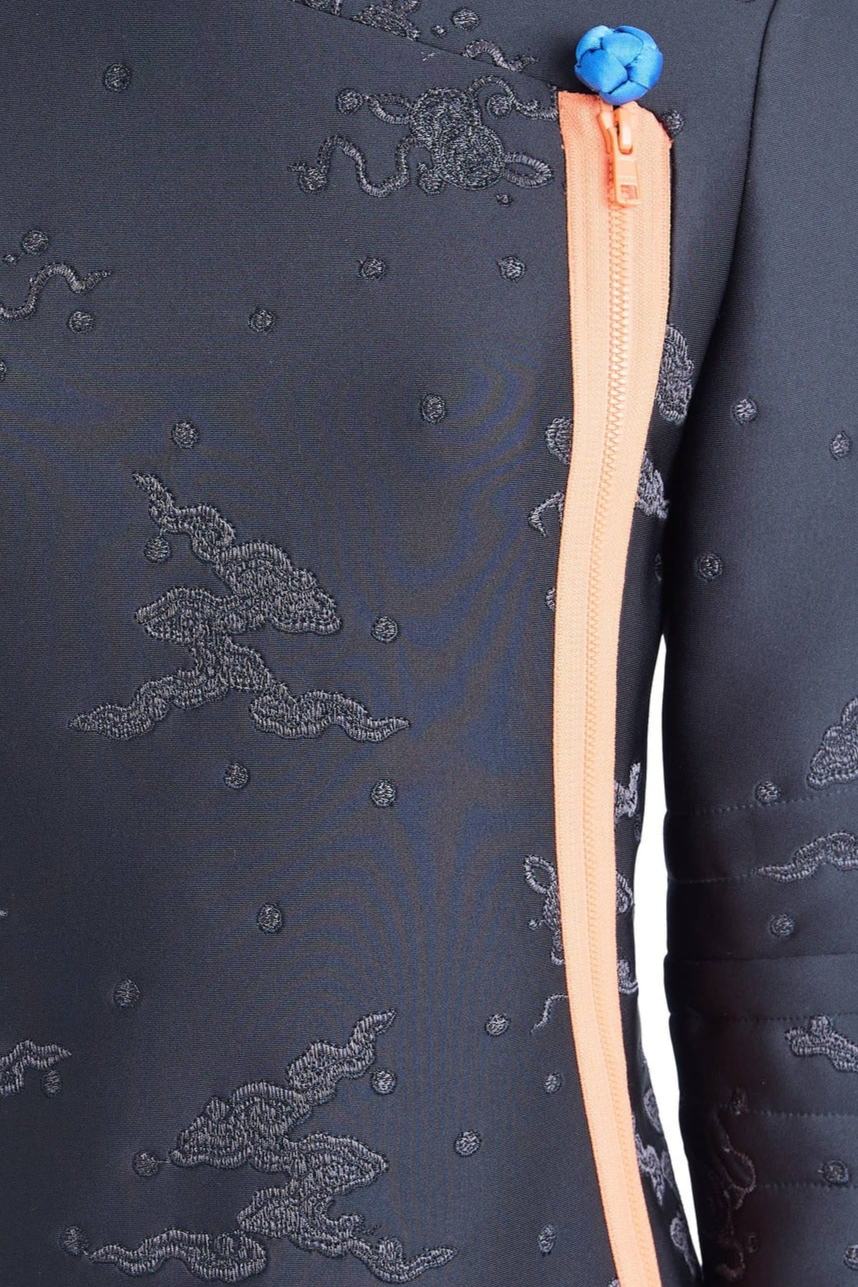 This short black Qipao, reimagined through modernized tailoring, features a striking orange contrast zipper. Adorned with meticulously embroidered classical "sea and cliff" patterns, evoking an Eastern poetic essence. Where time-honored embroidery converses with modern hardware, and classic charm intertwines with bold design.